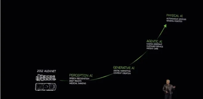 2025年,黄仁勋在CES主舞台的主题演讲中,系统梳理了AI的演进路径,提出了一个极具前瞻性的概念——物理AI(Physical AI)。他指出,过去十几年,AI经历了两个核心阶段:感知AI(让机器学会“看”)、生成式AI(让机器学会“写”和“画”),而现在,AI正迈入第三个阶段:物理AI,即能够理解物理世界规律、进行推理规划并自主行动的AI系统。与只能处理虚拟数据的大语言模型、图像模型不同,物理AI需要直面重力、摩擦力、惯性等物理规律,在真实的三维世界中完成感知、推理、决策与行动。
