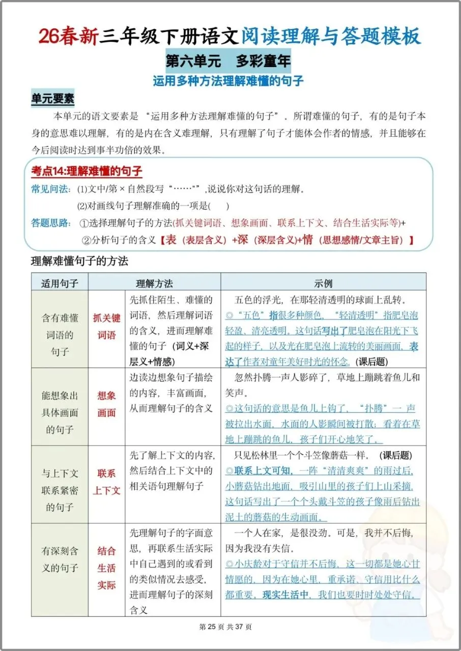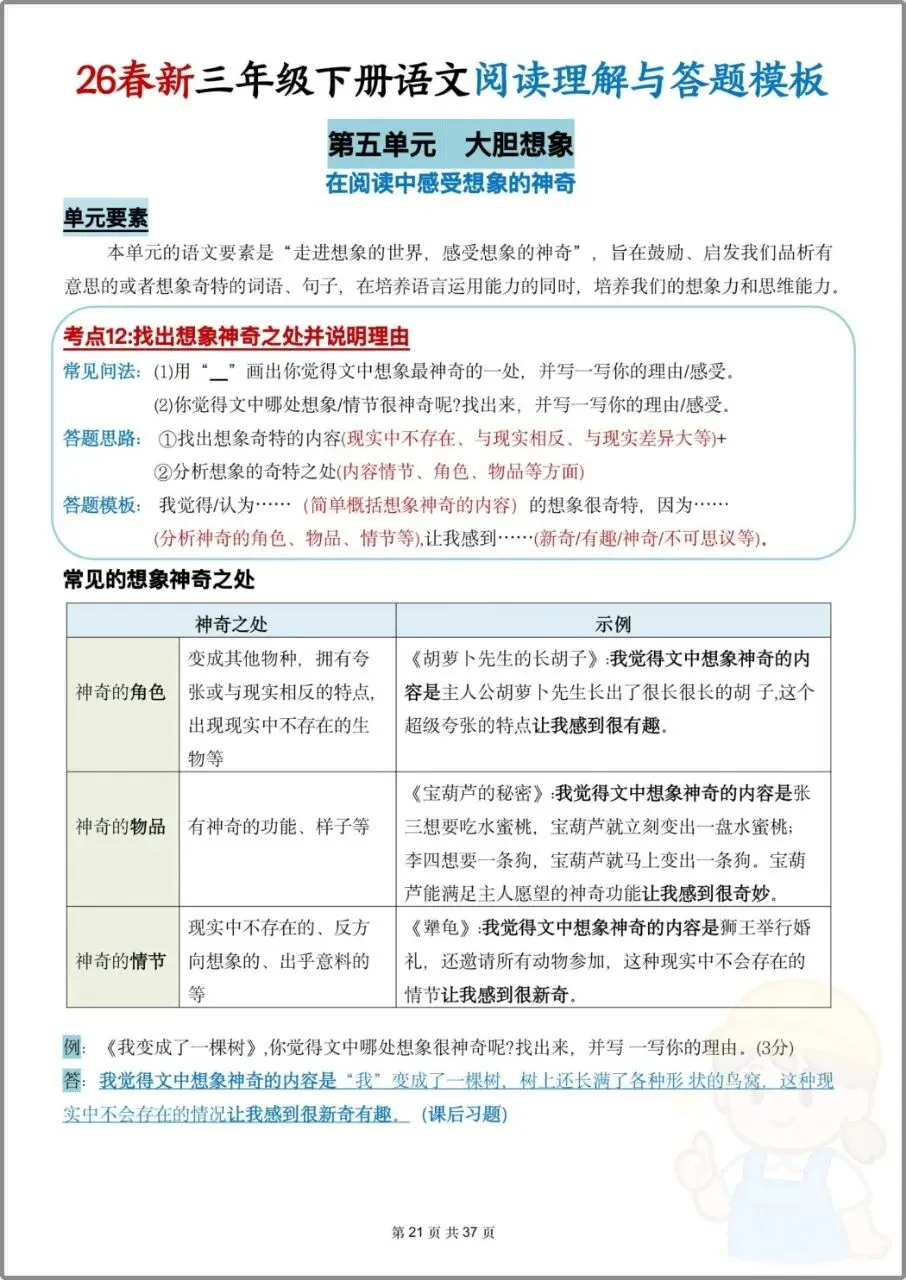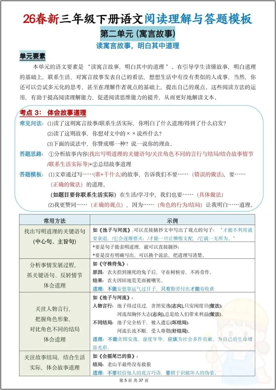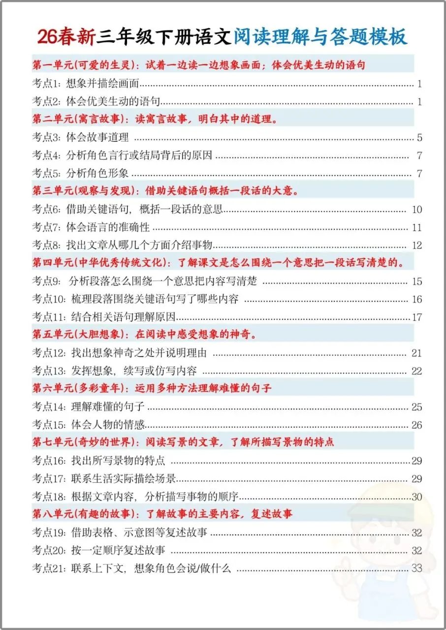 今日份分享:26年三年级下册《语文阅读理解与答题模板》。按单元拆解21个高频考点,从想象画面、赏析语句,到概括段意、体会道理、复述故事,全给了答题思路+满分模板,还配专项练习。