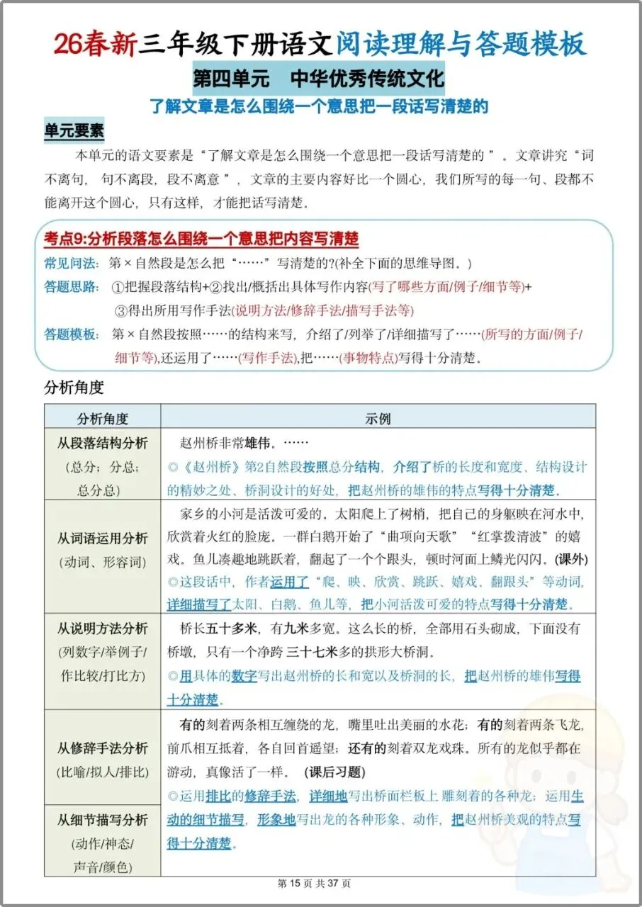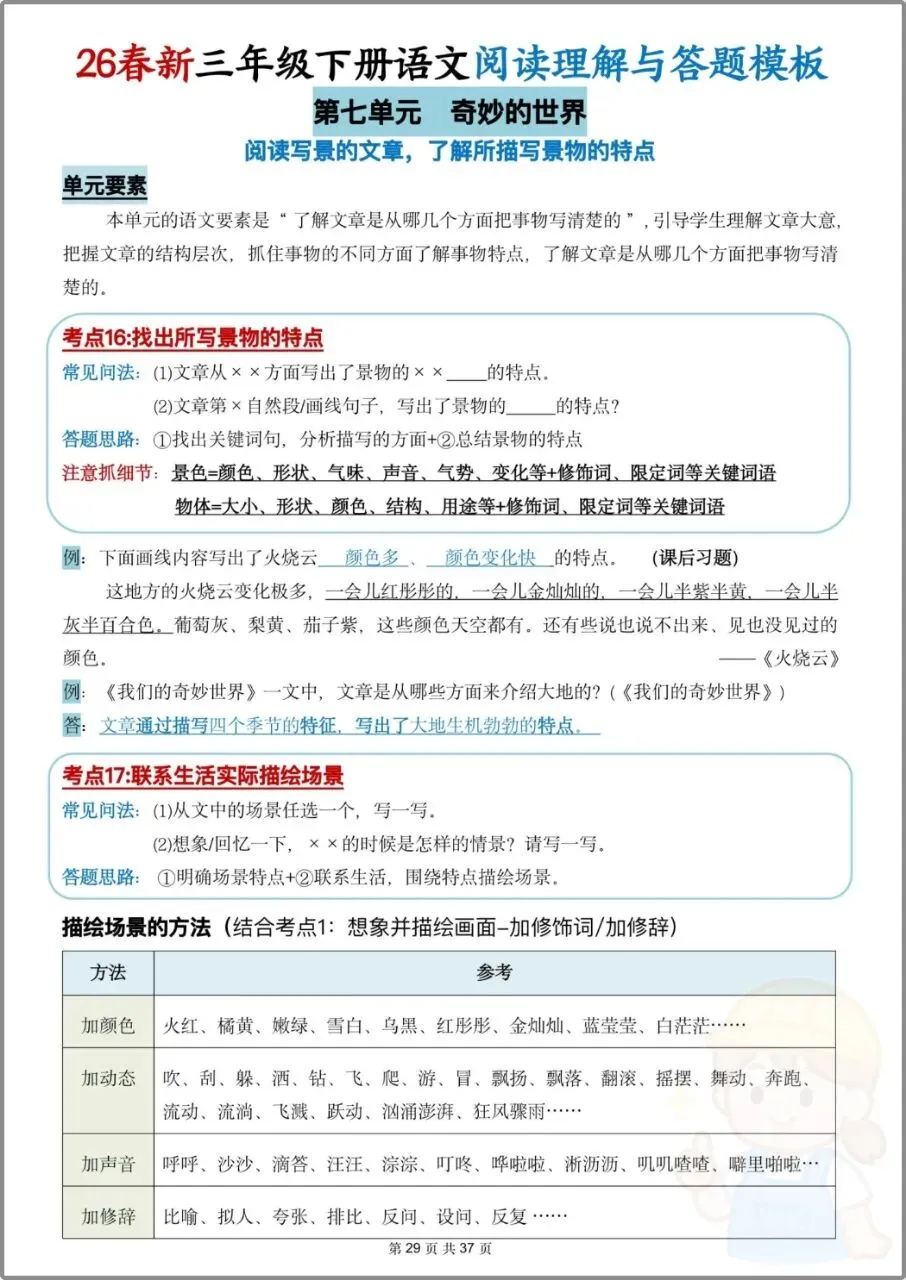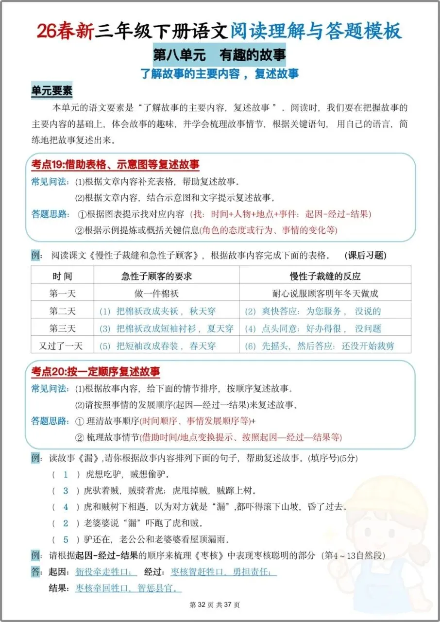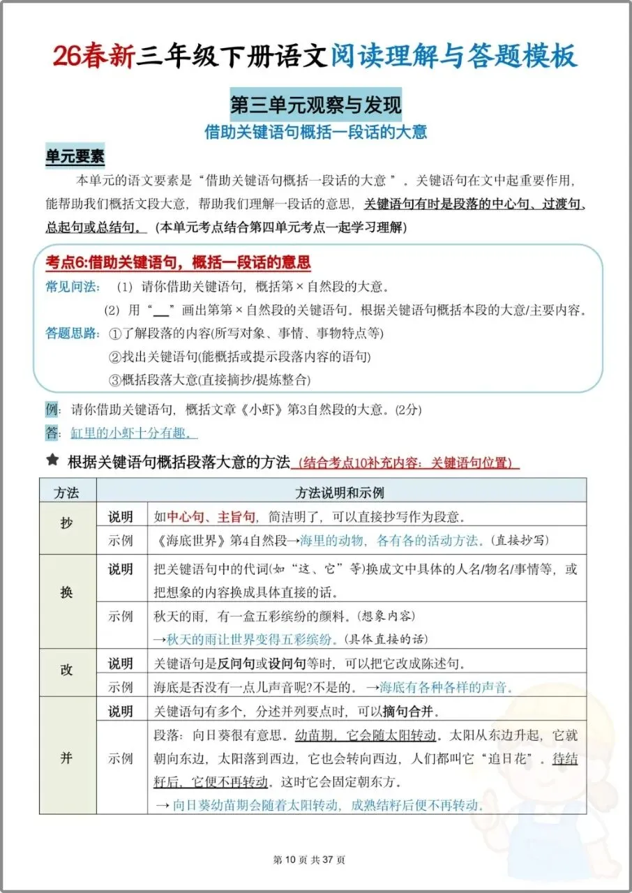 今日份分享:26年三年级下册《语文阅读理解与答题模板》。按单元拆解21个高频考点,从想象画面、赏析语句,到概括段意、体会道理、复述故事,全给了答题思路+满分模板,还配专项练习。