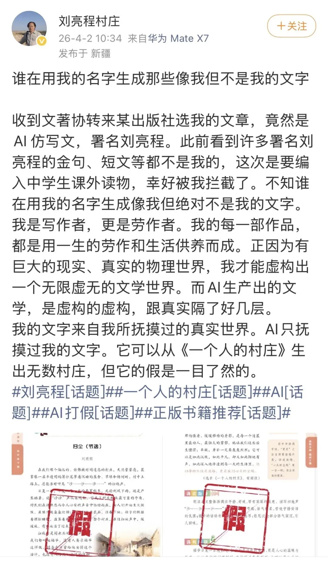 ▷作家刘亮程打假AI仿写文章。“谁在用我的名字生成那些像我但不是我的文字。”4月2日,刘亮程在微博发文称,收到文著协转来某出版社选的他的文章,竟然是AI仿写文,署名“刘亮程”。刘亮程表示,“我的文字来自我所抚摸过的真实世界。AI只抚摸过我的文字。它可以从《一个人的村庄》生出无数村庄,但它的假是一目了然的。”