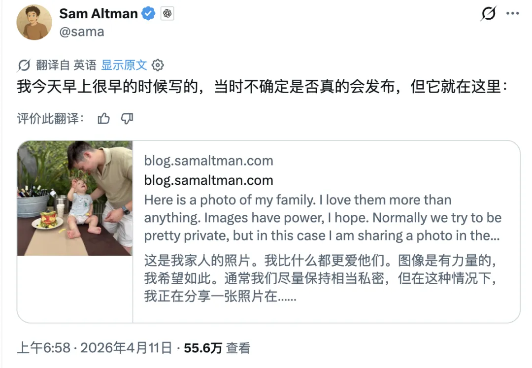奥特曼解释为何要发布家人的照片:“希望能让下一个人在冲我家扔燃烧瓶之前三思,无论他们对我有什么看法。”