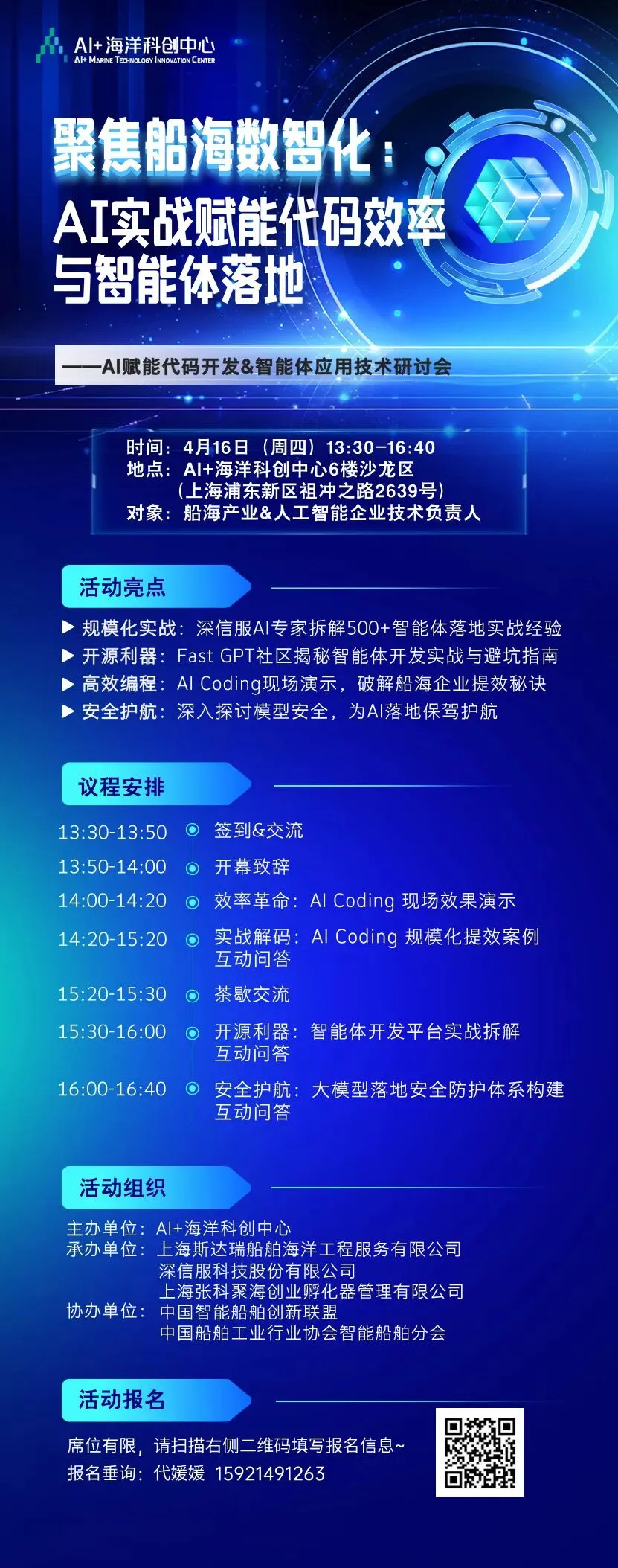 4月16日,AI+海洋科创中心将举办“聚焦船海数智化:AI实战赋能代码效率与智能体落地”沙龙活动,将围绕AI Coding规模化提效、效果演示、智能体开发平台实战拆解及模型安全防护等议题展开。