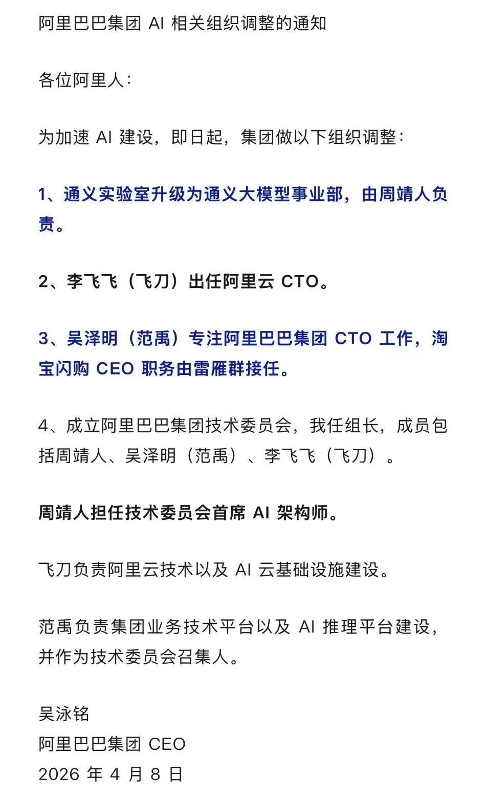 而就在两天前的4月8日,阿里集团CEO吴泳铭通过一封内部信,完成了阿里历史上最冷酷也最彻底的一次技术资产清算——通过组建由其亲自挂帅的“技术委员会”,阿里正式宣告:AI大模型在阿里的“实验室孵化期”已经结束,一场重回马云时代“商业效率至上”的铁血决战拉开帷幕。