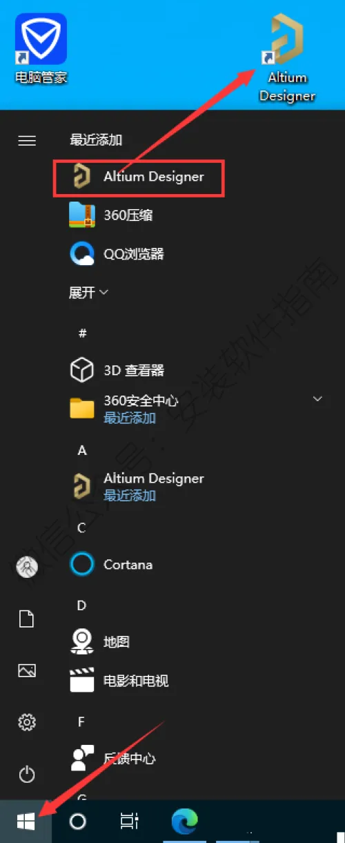12、软件安装后快捷方式不会自动出现在桌面,我们左键点击【开始菜单】,在最近添加中找到【Altium Designer】软件,可以把它直接拖到桌面即可。