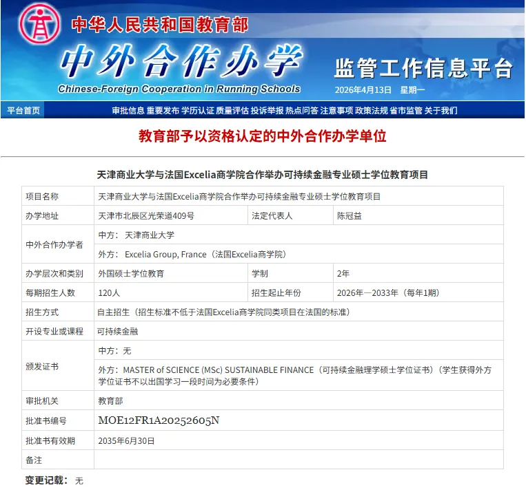学位认证:毕业后获得法国Excelia商学院《可持续金融理学硕士学位证书》,与出国留学所获学位完全一致,可直接在中国教育部做学历学位认证,含金量拉满