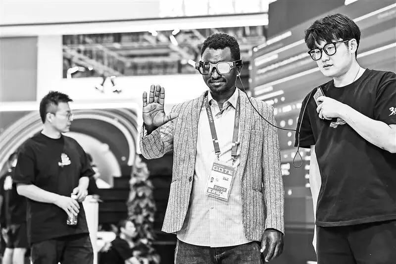 外籍客商(右二)在第四届全球数字贸易博览会人工智能展区体验智能眼镜设备。新华社记者 江汉摄