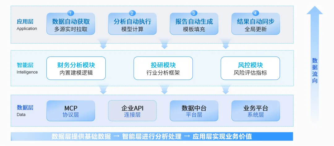 构建垂直领域能力——财务分析模块内置财务建模逻辑和估值方法论,投研模块内置行业分析框架和可比公司分析模型,风控模块内置风险评估指标和预警规则。