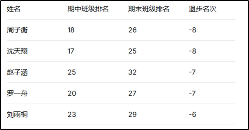 2. 进退步分析:列出进步最大的5人和退步最大的5人