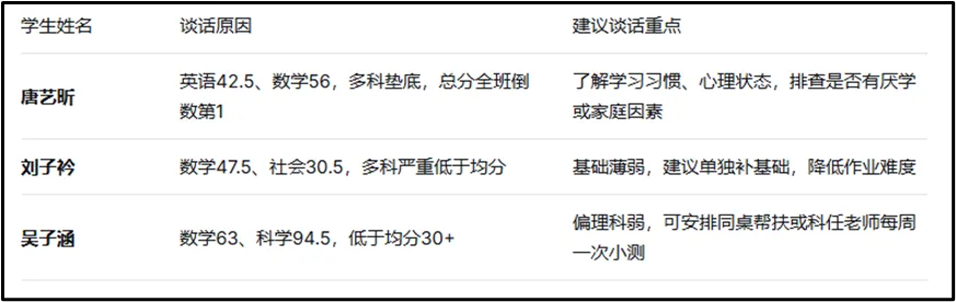 我把全班的期中、期末成绩表喂给DeepSeek,3分钟后,它直接告诉我: