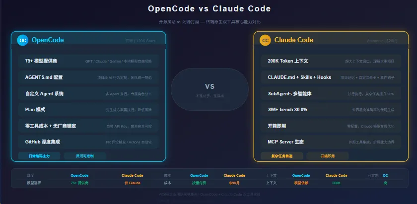 这个差异决定了它们各自的最佳使用场景:OpenCode 适合日常编码中需要频繁切换模型、控制成本、定制行为的场景;Claude Code 适合需要最高推理质量的复杂任务。