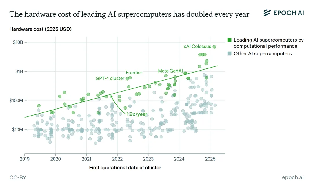 从 2010 年深度学习时代开始,用于训练 AI 模型的算力,每年增长约 4~5 倍,14 年来几乎未曾中断。这种增长不是线性的,而是指数级的——就像银行里不断复利的存款。