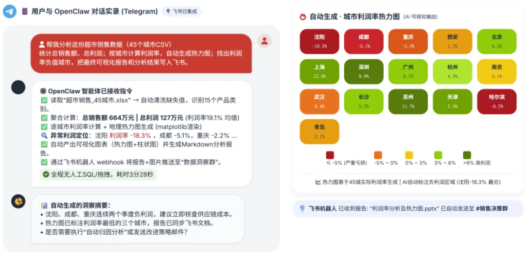 统计了45个城市、多产品类别的销售额,总销售额664万元,总利润127万元;计算各城市利润率,自动生成了热力图;精准定位出沈阳(利润率-18.3%)、成都等负利润城市;最终输出可视化图表和分析报告,自动写入了飞书,整个过程没有写一行SQL,不用手动拖拽图表,用自然语言对话就能完成。