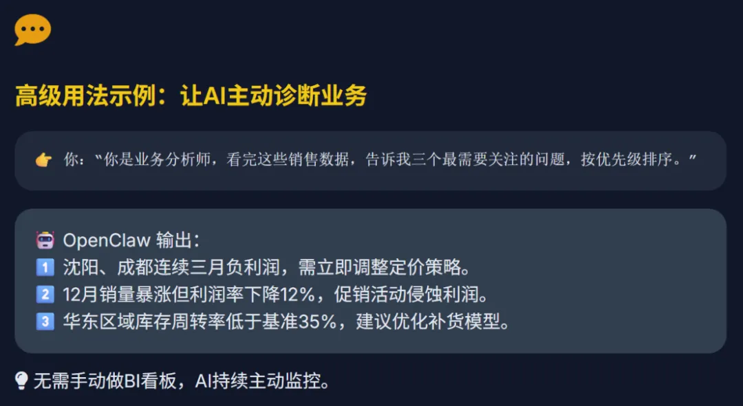 更高级的用法是让AI主动帮你找出业务中需要关注的问题。你可以这样指令:“你是业务分析师,看完这些数据,告诉我三个最需要关注的问题,按优先级排序。”OpenClaw会直接生成问题列表并排好优先级。