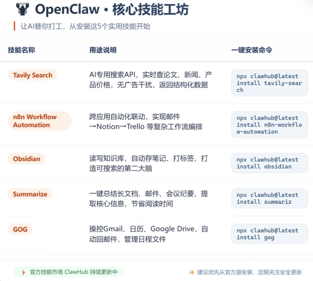 很多人部署完OpenClaw后发现它只能简单聊天,无法实现高效办公。原因是缺少核心技能。下面这5个技能是我自己用下来觉得最实用的。