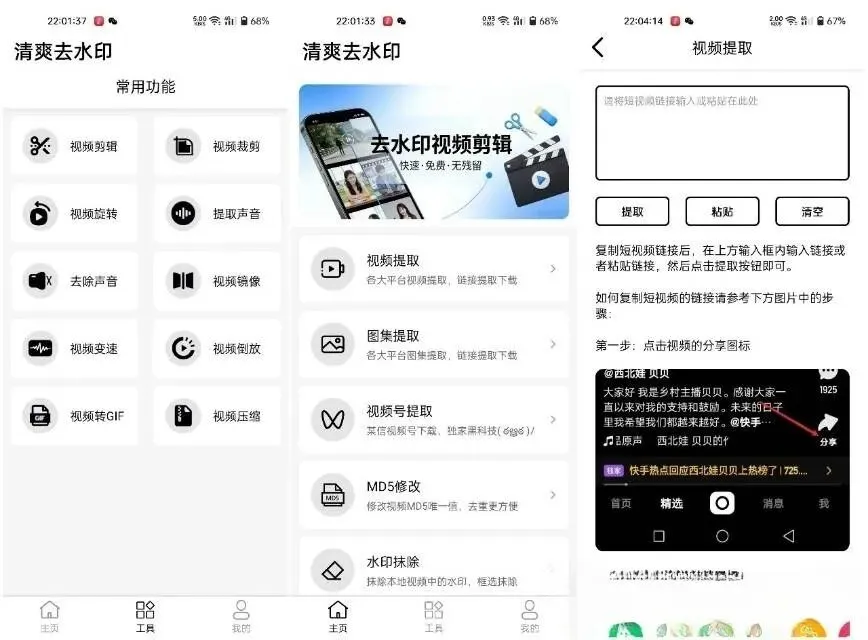 这是一款短视频下载APP,支持众多流行平台下载,比如筷手、钭音、小红书等都可以直接解析一键下载,封面、视频、图集、文案都可以获取到。重点是完全免费,无需注册无需登录,直接就可以使用