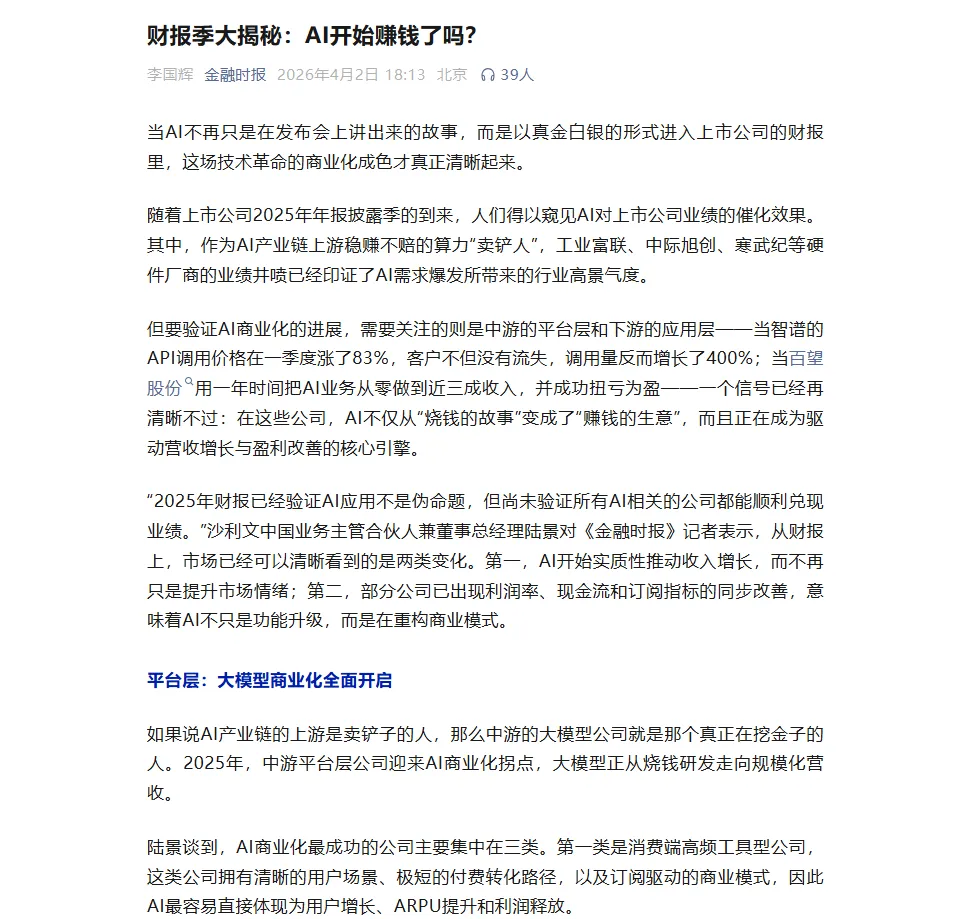 *本采访刊登于《金融时报》,记者为李国辉,原文标题为:财报季大揭秘:AI开始赚钱了吗?
