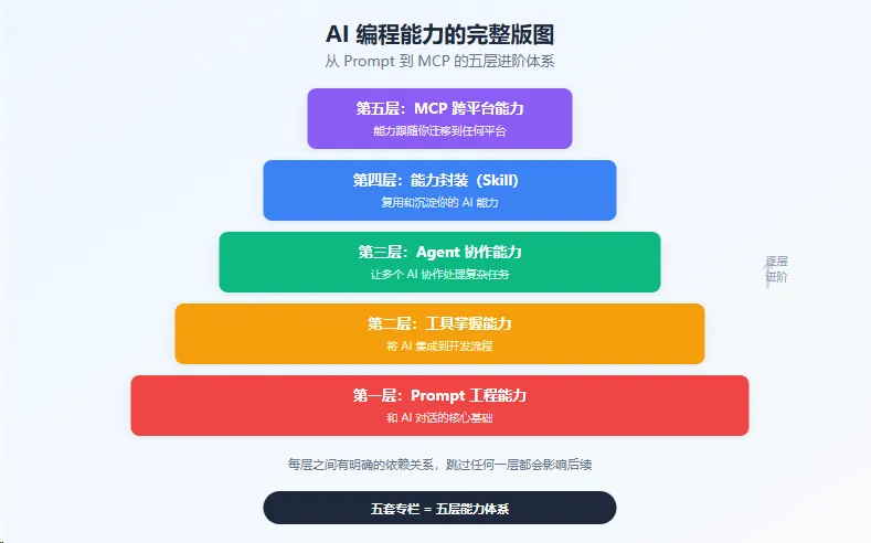 如果你关注 AI 编程领域,可能已经发现:这五层能力体系,正好对应五套专栏的内容。