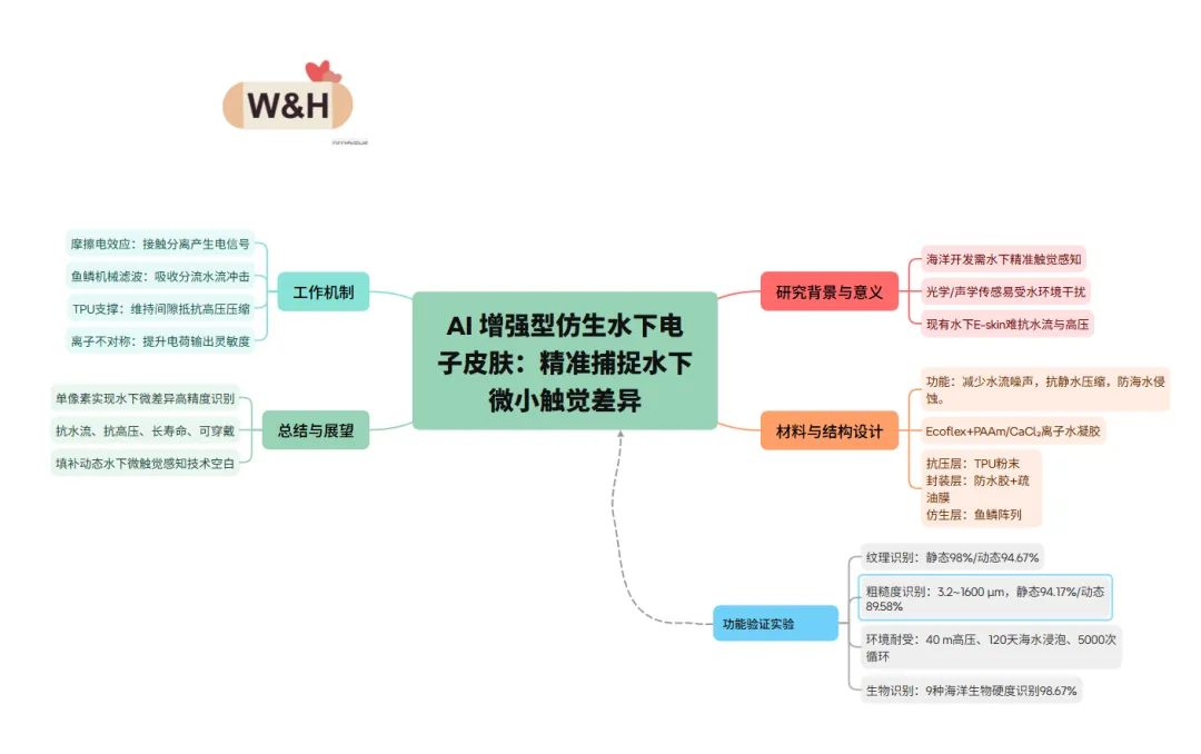 该电子皮肤可精准识别纹理、粗糙度、硬度,耐受深海高压与长期海水浸泡,还能检测机器鱼游动状态,为水下机器人触觉感知、智慧水产养殖、深海资源勘探提供了新的解决方案,突破了传统水下传感的局限性。
