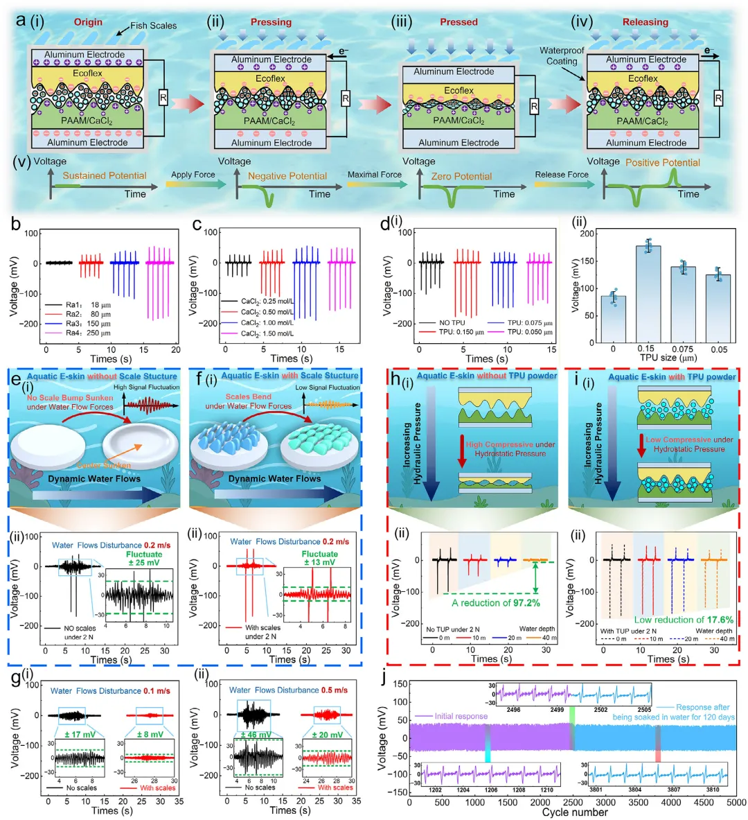 (a)描述了水生电子皮肤的水下工作机制。(b-d)在Z轴线性位移平台上,使用10毫米的加载探针对其表面施加受控振幅和频率的法向力。输入力通过六轴力/扭矩传感器(Mini40,ATI工业自动化;分辨率0.01 N)实时测量。输出电压随微观结构尺寸的增大而近似线性增加,增加CaCl2浓度会加剧离子不对称性并增强其电子供体倾向,而过高的CaCl2浓度则会开辟额外的离子泄漏路径并降低水生电子皮肤的输出性能。此外,相较于未添加TPU的E-skin,添加TPU可显著增加有效接触面积和输出电压。(e-g)表明所设计的鱼鳞状表面展现出优异的动态水流阻力性能。上述实验确定了水生电子皮肤的关键结构参数。