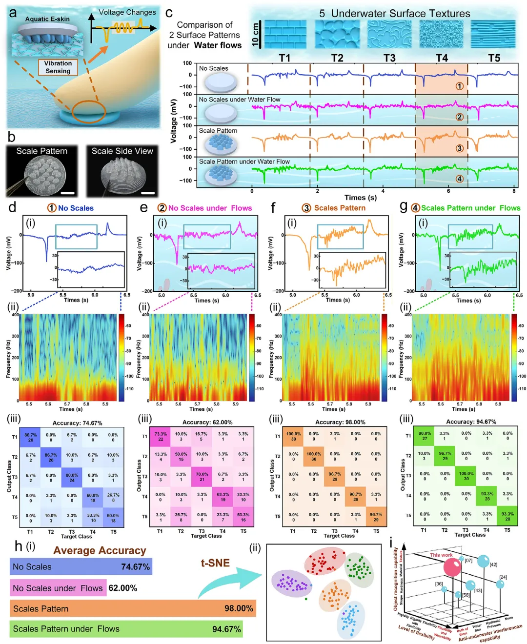(a)仿生鱼鳞可有效抑制水流干扰。(b)仿生鱼鳞表面图像(c-g)证实,仿生鱼鳞设计不仅能提升微弱振动信号的丰富度,还能在不同水生环境中保持信号的可区分性。(h-i)构建不同水流条件及五种表面纹理,用一维卷积神经网络(1D CNN)分析触觉信号表明水生电子皮肤在动态水流环境中实现了高精度纹理识别(准确率>94%),同时能够耐受强水流冲击、高静水压力及长期海水浸泡环境。