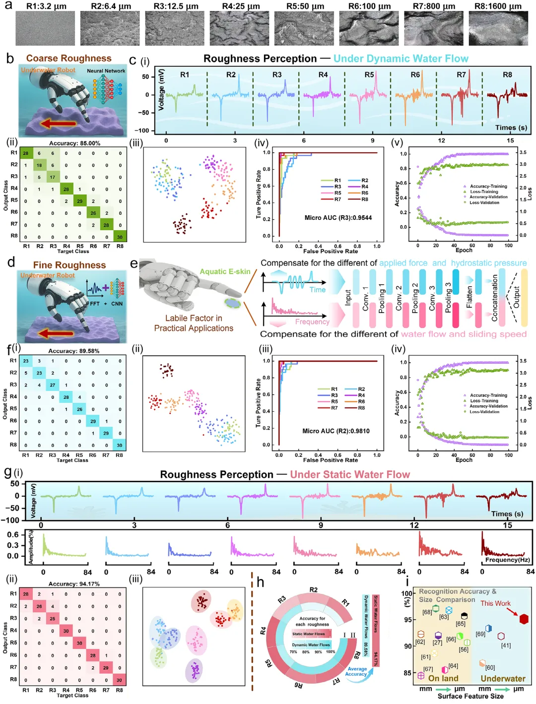 (a,b)测试8组跨尺度粗糙度样本(3.2至1600 μm)构建数据集,为后续在真实水下环境中的泛化验证提供基准。(c-e)表征了水下电子皮肤在静态水环境中解析精细表面粗糙度的能力。(f-i)采用在八种表面粗糙度基于特征融合的1D CNN深度学习,显著提升水生电子皮肤精度。