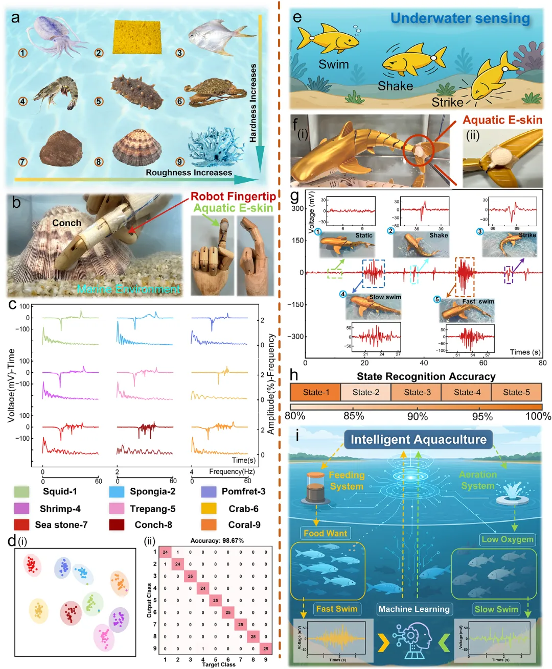 (a-b)选取了九种具有不同粗糙度和硬度的海洋相关目标进行对比,并将电子皮肤佩戴于机器人手指模拟感知。(c-d)相应的时域电压信号、频域振幅曲线与t-SNE可视化图,表明该水下电子皮肤在九种海洋生物/物体检测中实现了高达98.67%的平均准确率并呈现出清晰的聚类特征。(e-f)将水下电子皮肤附着于机器人鱼尾部,并于水槽测试平台中检测五种行为状态。(g-h)相应电子皮肤输出信号及准确率,深度学习模型平均准确率达90%。(i)由上述实验提出,证明该款水下电子皮肤在智能水产养殖领域具有充分应用潜力。