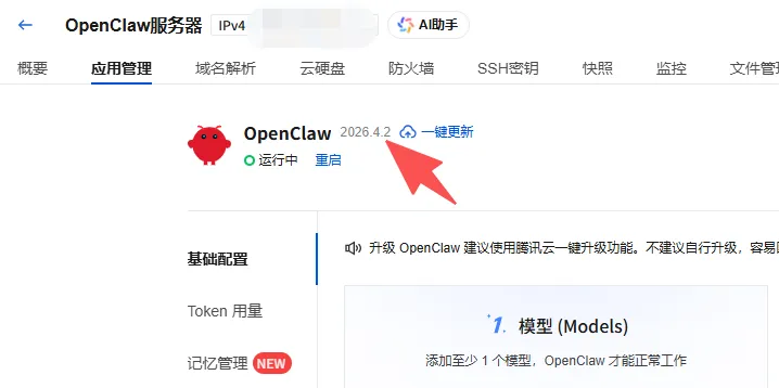 如果你是用腾讯云轻量服务器部署的OpenClaw,一般情况下,升级很简单——直接点击腾讯云控制台的"一键升级"按钮就行。