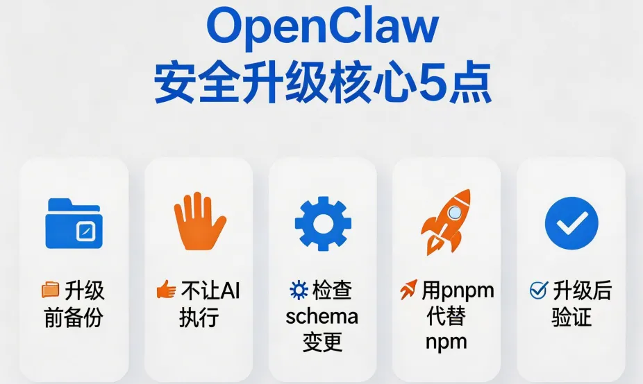 # ===== OpenClaw 安全升级完整流程 =====# 1. 备份(云服务器做快照,非云服务器打包目录)$ tar -czf openclaw-backup.tar.gz ~/.openclaw# 2. 修复配置(删除schema不兼容的额外字段)$ jq 'del(.channels.feishu.accounts[].botName, .channels.feishu.accounts[].enabled)' ~/.openclaw/openclaw.json > ~/.openclaw/openclaw-fixed.json && mv ~/.openclaw/openclaw-fixed.json ~/.openclaw/openclaw.json# 3. 验证配置$ cat ~/.openclaw/openclaw.json | jq '.channels.feishu.accounts'# 4. 升级安装(用pnpm,更快更稳)$ pnpm install -g openclaw@latest# 5. 启动服务$ openclaw gateway start# 6. 验证版本$ openclaw --version$ openclaw status