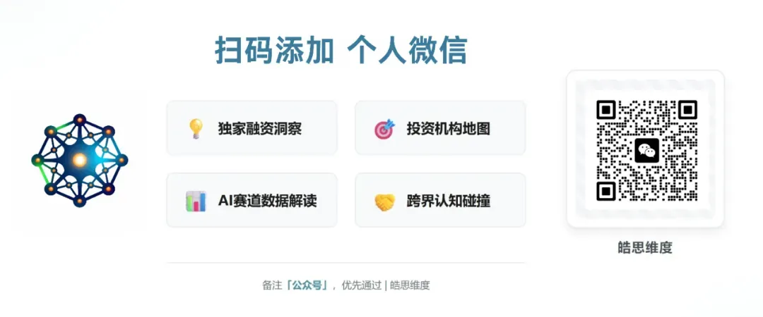 如果你正在寻找适配的投资人,或需要优化融资策略,欢迎联系皓思维度。我们专注AI垂直赛道FA服务,帮助AI创始人匹配最合适的资本,也欢迎AI领域投资人与我们交流,共同发现下一个改变行业的创新者。