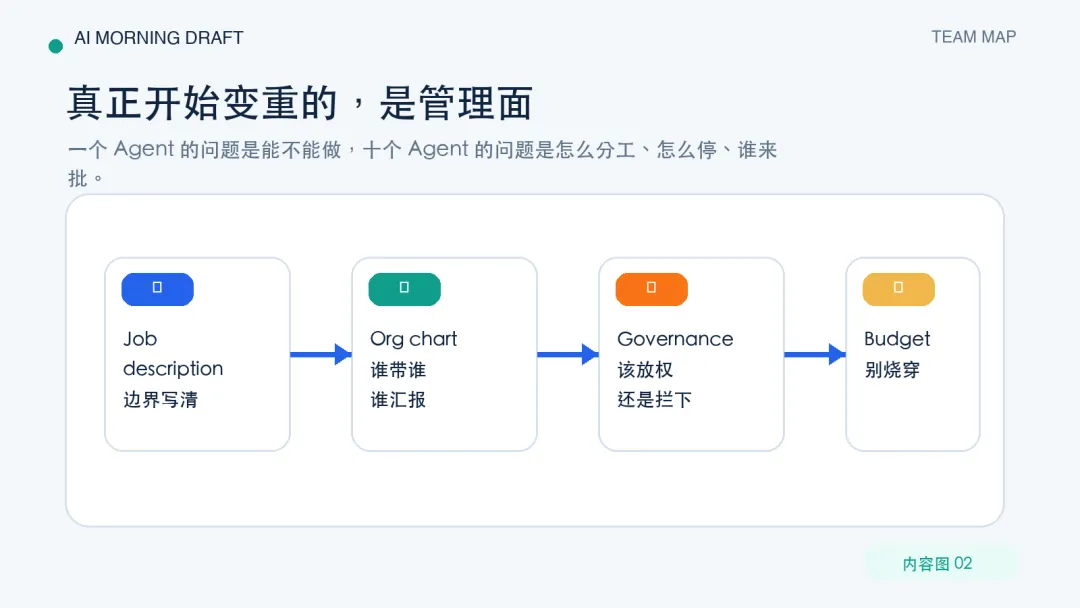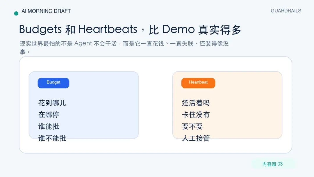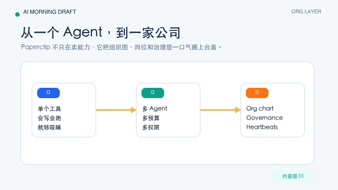 它是说,我要把岗位、预算、汇报、审批、检查点、心跳这些以前藏在人类组织里的东西,直接搬到 Agent 前台。