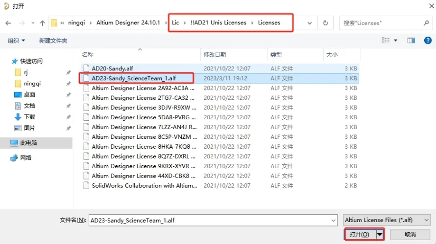 17. 弹出窗口,找到软件安装包Lic\!!AD21 Unis Licenses\Licenses里面的AD23-Sandy_ScienceTeam_1.alf打开。