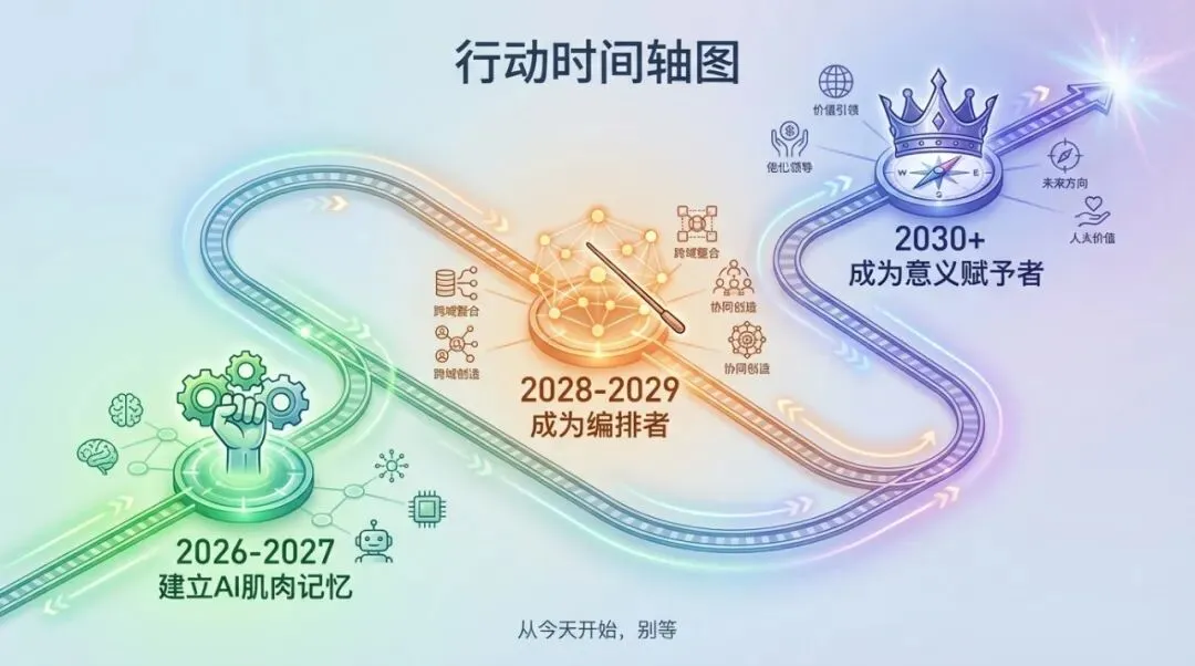 ✅ 在AI给出方案后,你负责问三个问题:对不对?该不该?值不值? ✅ 建立个人信誉资产:行业声誉、案例库、信任网络——这些是AI无法替你积累的 ✅ 从「做事的人」变成「定义什么事该做的人」
