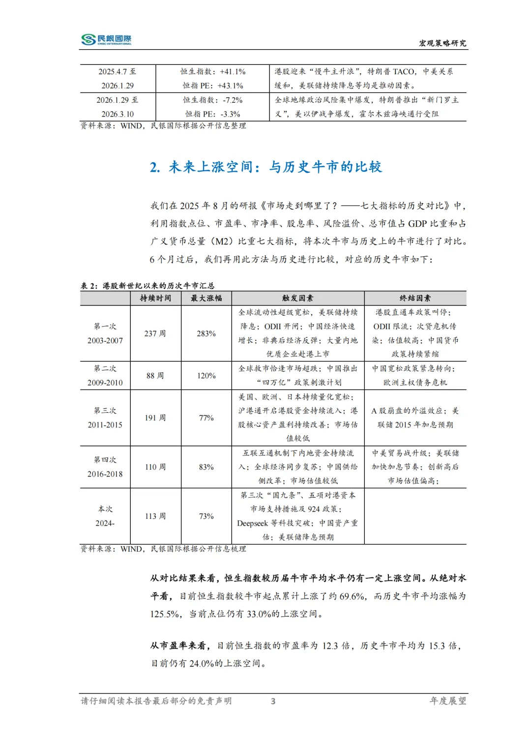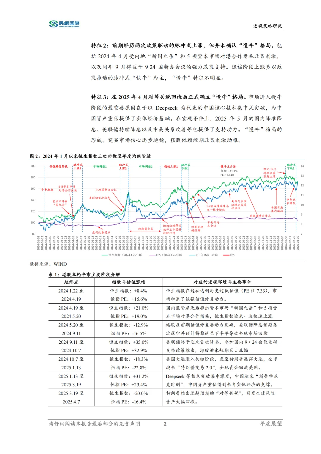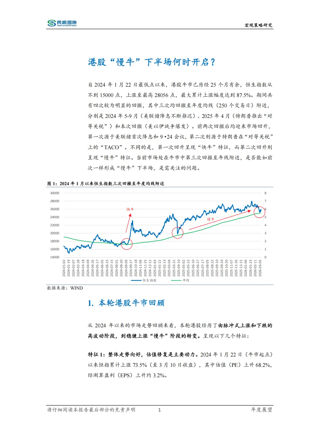 自2024年1月22日最低点以来,港股牛市已历经25个月有余。通过本轮牛市回顾,当前市场已由脉冲式上涨和下跌的高波动阶段,转变到稳健上涨的“慢牛”阶段。在经历1月底以来的调整之后,恒生指数再次回调至年度均线并呈现企稳状态,而前两次回归至年线都伴随着市场新上升行情,目前“慢牛”下半场正在蓄势之中。