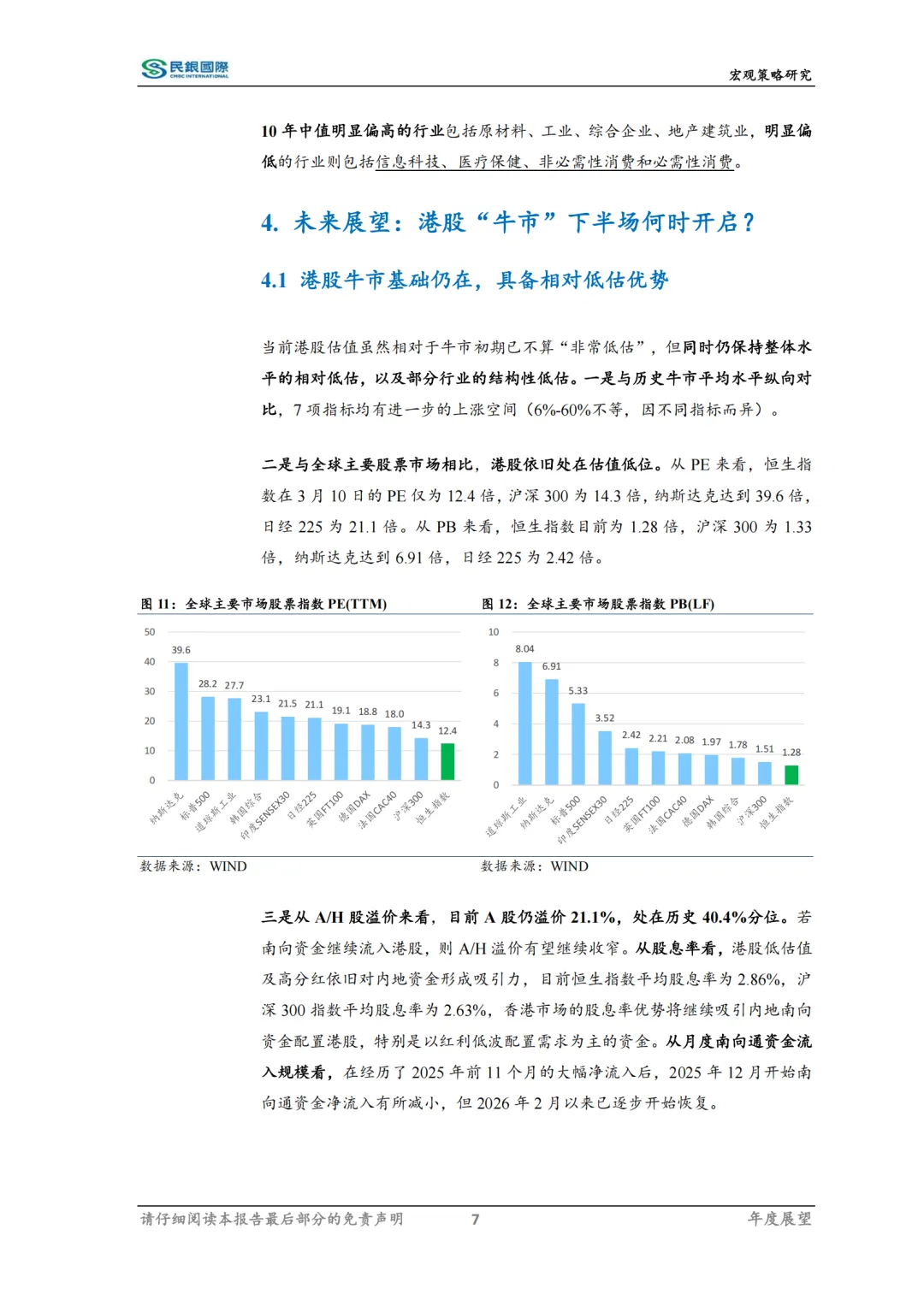 展望未来,港股牛市基础仍在,具备相对低估优势。一是距离历史牛市的平均水平仍有差距;二是与全球主要股票市场相比,港股依旧处在估值低位;三是A股对H股仍有溢价,港股股息率有优势,南向资金已逐步恢复;四是部分行业依旧处在低估位置。