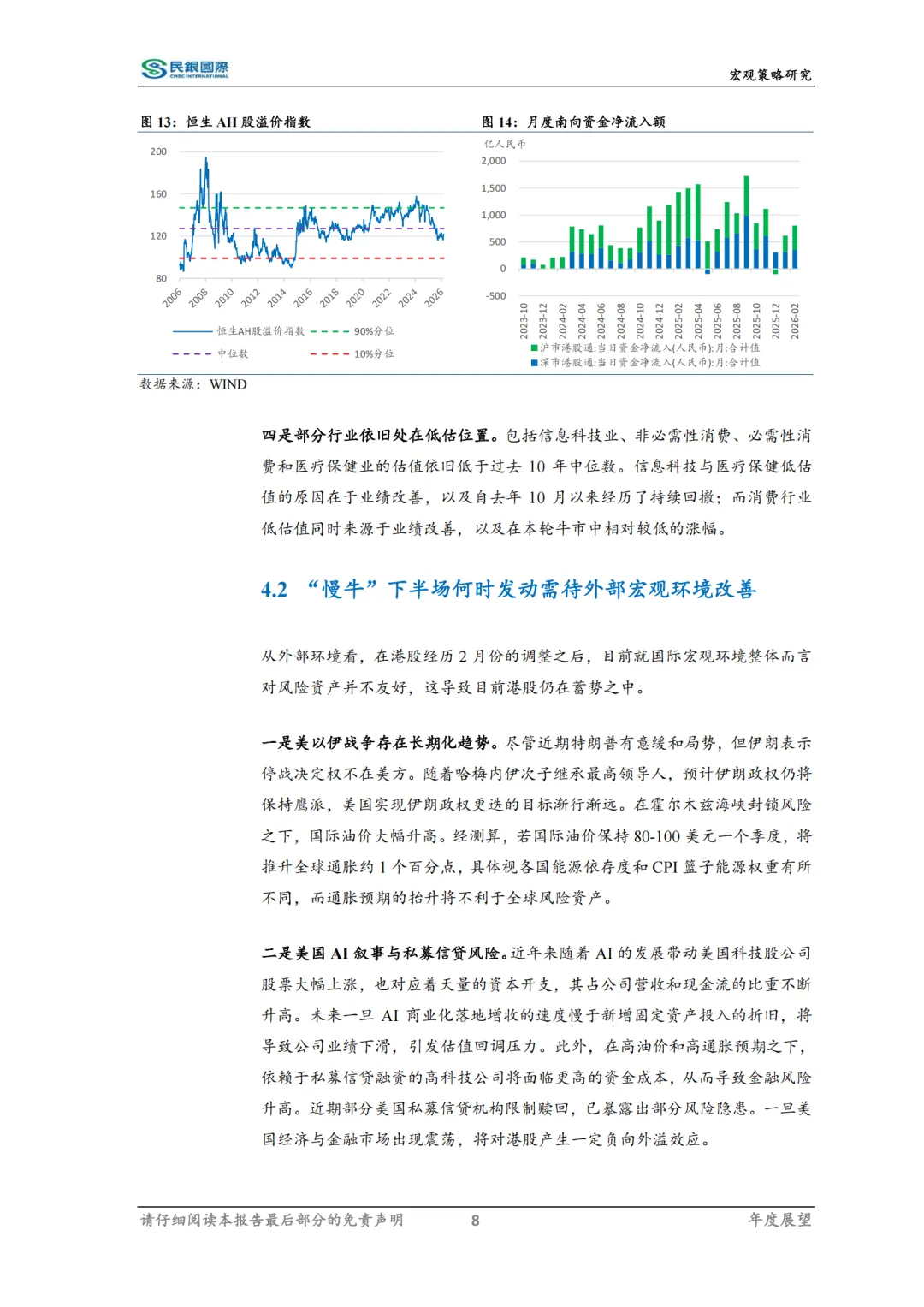 不过当前外部宏观环境暂不友好,一是美以伊战争存在长期化趋势;二是美国AI叙事与私募信贷面临风险;三是新任美联储主席或偏向鹰派。目前需等待外部国际宏观环境转向有利的方向,特别是一旦美以伊战事转向缓和,将有望开启“慢牛”下半场。