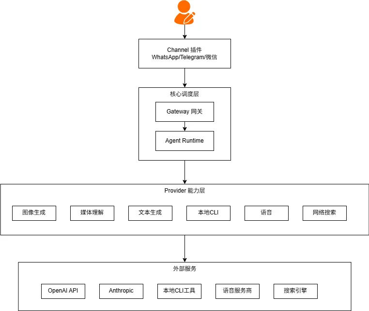 OpenClaw 本身不提供 AI 能力——它是一个 “调度器” 和 “网关”。实际的 AI 能力(文本生成、图像理解、语音合成等)由外部服务提供。Provider 插件就是 OpenClaw 与这些外部 AI 服务之间的“翻译层”。