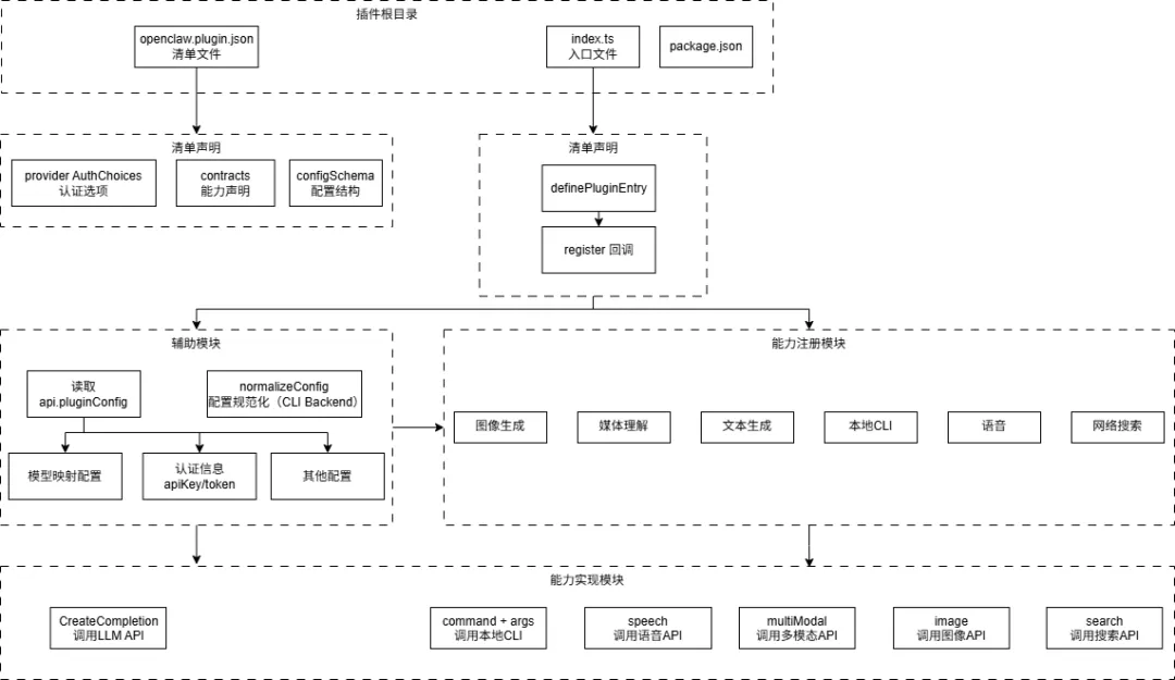 import { definePluginEntry } from "openclaw/plugin-sdk/plugin-entry";export default definePluginEntry({id: "unified-ai",name: "Unified AI Provider",version: "1.0.0",register(api) {const apiKey = (api.pluginConfig as { apiKey?: string })?.apiKey;// 注册 LLM Providerapi.registerProvider({id: "unified-ai",name: "Unified AI",models: [{id: "ua-pro",name: "Unified AI Pro",contextWindow: 200000,supportsVision: true,supportsStreaming: true,supportsToolUse: true,},],async createCompletion(params) {// 实现 LLM 调用逻辑},});// 注册图像生成api.registerImageGenerationProvider({id: "unified-ai",name: "Unified AI Image",async generate(params) {// 实现图像生成逻辑},});// 注册网络搜索api.registerWebSearchProvider({id: "unified-ai",name: "Unified AI Search",async search(query, options) {// 实现搜索逻辑},});// 在清单中声明所有能力// contracts 字段在 openclaw.plugin.json 中声明},});