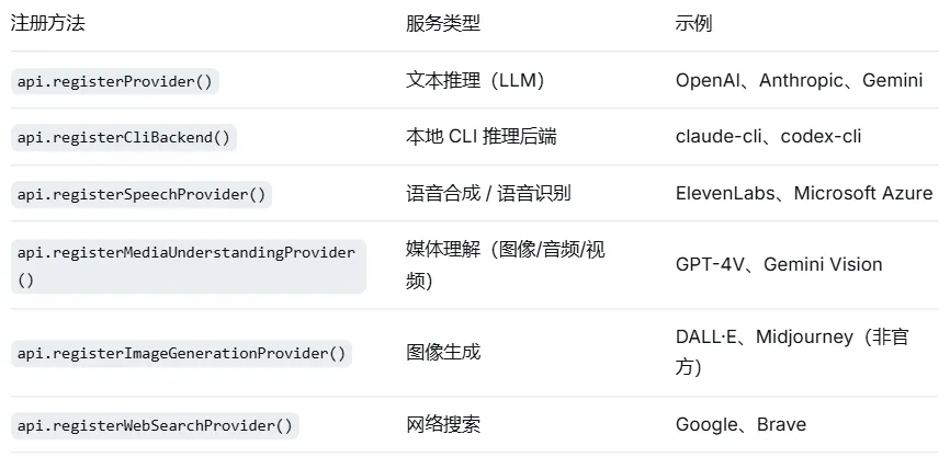 一个插件可以同时注册多种 Provider 能力。例如,OpenAI 官方插件同时注册了 LLM、图像生成、媒体理解和语音能力。这个表格列出的就是 register(api) 回调中 api 对象上所有以 Provider 结尾的注册方法——它们都来自 api 对象,不需要额外的导入。
