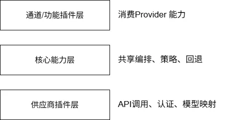 这种分层使得更换底层 AI 服务商时,上层的通道和功能插件无需任何修改。