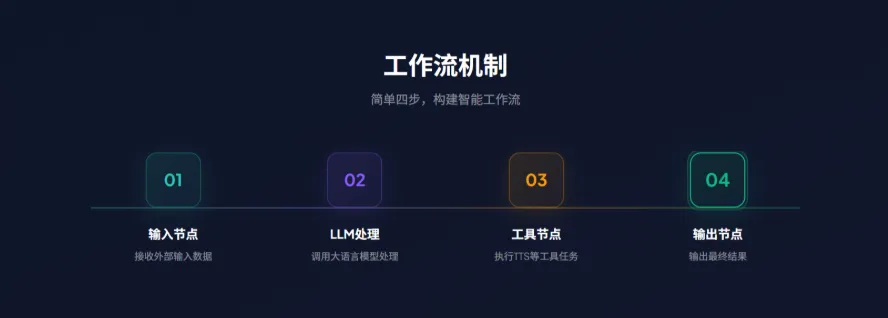 文本转语音全链路实现:串联文本输入、模型润色、TTS 工具、存储 / 播放节点,实现多语言语音合成,适配客服系统自动语音应答等场景;