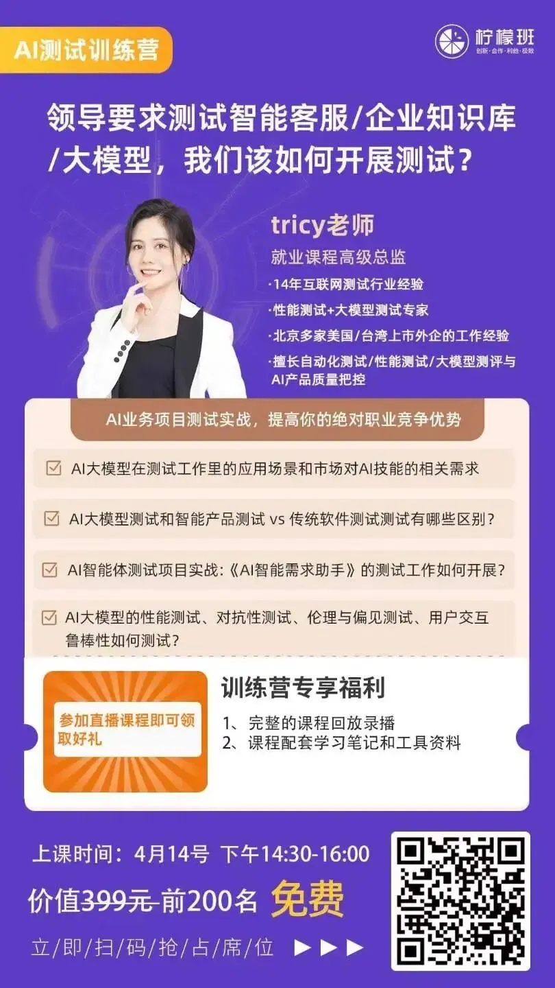 我们最近会有一个《大模型测评与AI产品质量把控》专题的免费训练营。价值399,前200位免费,如果你也感兴趣。可以扫码下方的二维码联系老师,老师会邀请你进群。