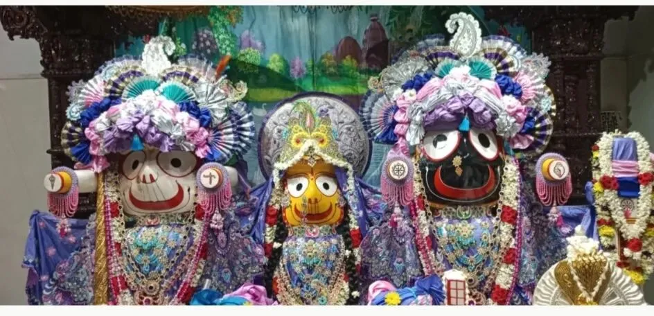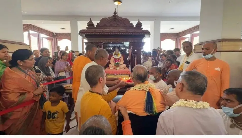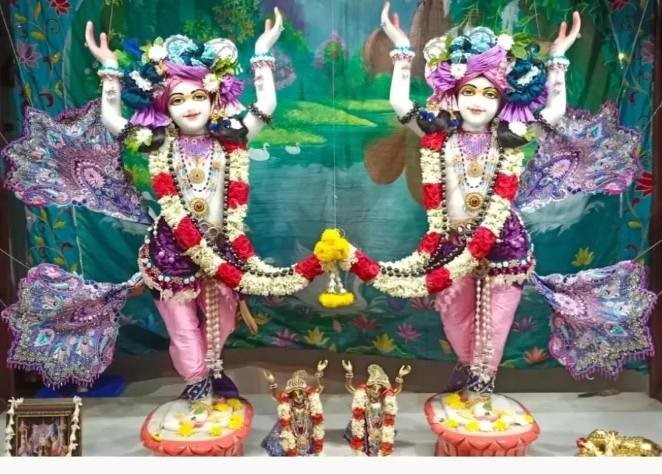 在上午11点30分,我前往曼迪尔。我得到了尼太•高冉嘎(Nitāi Gaurāṅga)、茹阿达•奎师那•拉丽塔•维莎卡 (Rādhā Kṛṣṇa Lalitā Viśākhā)、茹克蜜妮•奎师那•萨缇亚芭玛(Rukmiṇī Kṛṣṇa Satyabhāmā)、哥瓦尔丹•希拉(Govardhana-śilā)、佳甘纳特•巴拉戴瓦•苏巴卓•苏达尔善•查夸(Jagannātha Baladeva Subhadrā Sudarśana Cakra),以及拉克施蜜•纳茹阿星哈(Lakṣmī Narasiṁha)的达尔善。我向塔库尔们以及施瑞拉•帕布帕德(Śrīla Prabhupāda)供奉了鲜花和灯。