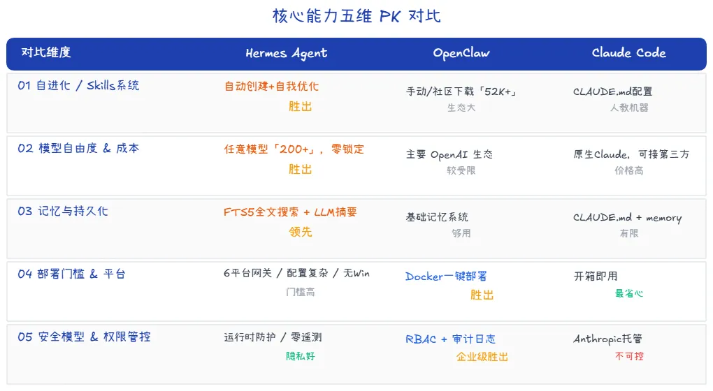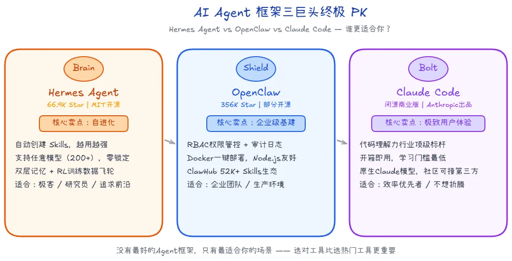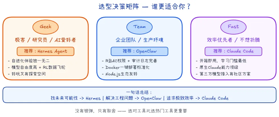 如果你在寻找未来的可能性,选 Hermes;如果你在解决当下的工程问题,选 OpenClaw;如果你不差钱只想效率最大化,选 Claude Code。