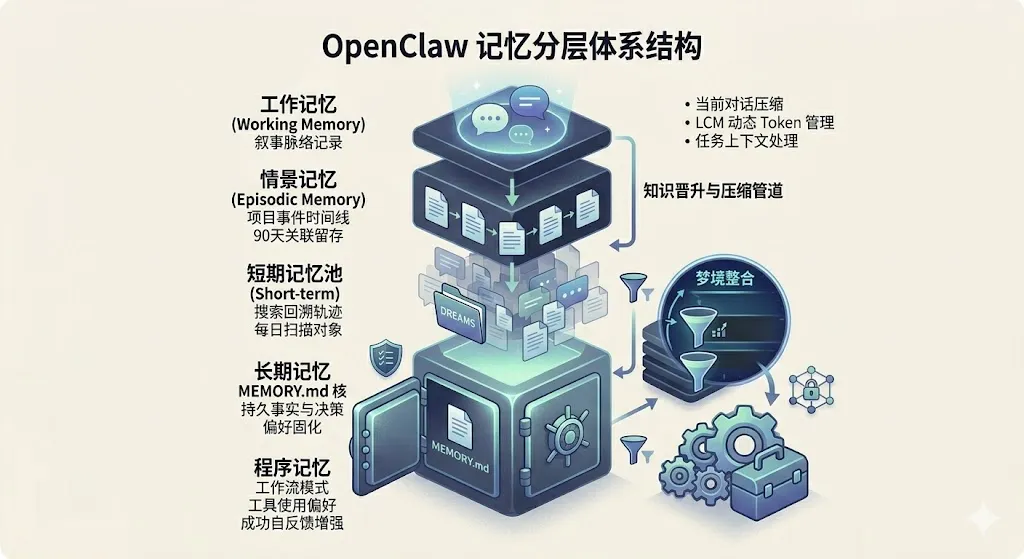 为了支撑梦境功能的运作,OpenClaw 构建了一个多层次的记忆堆栈。每一层都承担着不同的认知负载和存储周期,确保了信息流动的有序性。