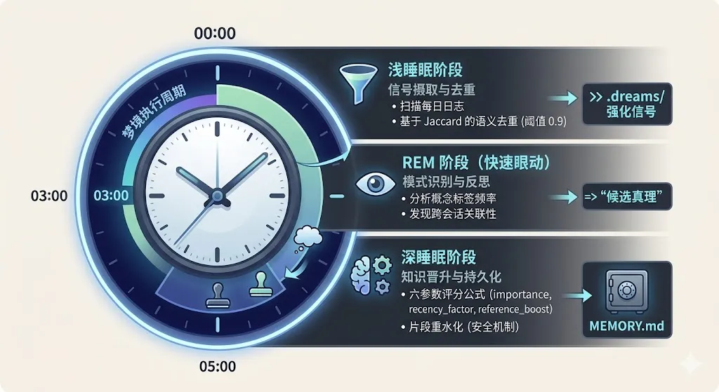 OpenClaw 梦境功能并非简单的批处理脚本,而是一个高度结构化的后台异步进程。开启后,系统默认在每日凌晨 3 点执行一轮完整的“睡眠”扫描。这一过程模拟了生物睡眠的三个关键阶段,每个阶段都具备独特的输入输出逻辑。