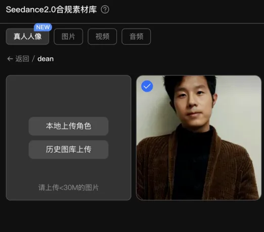 上传真人图片或视频/音频,即可生成视频。 新增「人像授权」能力,通过检测后可加入角色库,随时复用。
