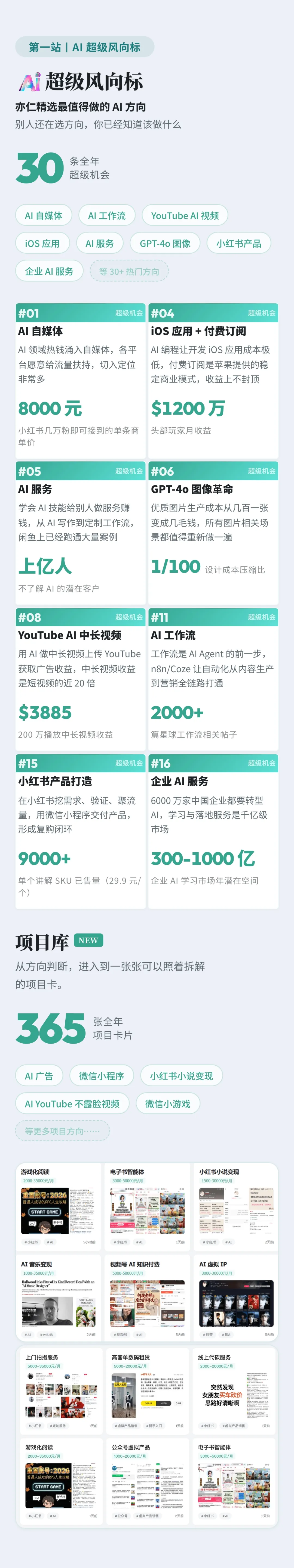 超级标的核心: 亦仁过去发布的 16 条超级标,本质可以归为五大方向:AI 自媒体、AI 视频、AI 应用(海外产品)、企业 AI 服务、垂直小号。术是复杂的,大道至简,创业者做的事情很可能就是这几大方向的结合。