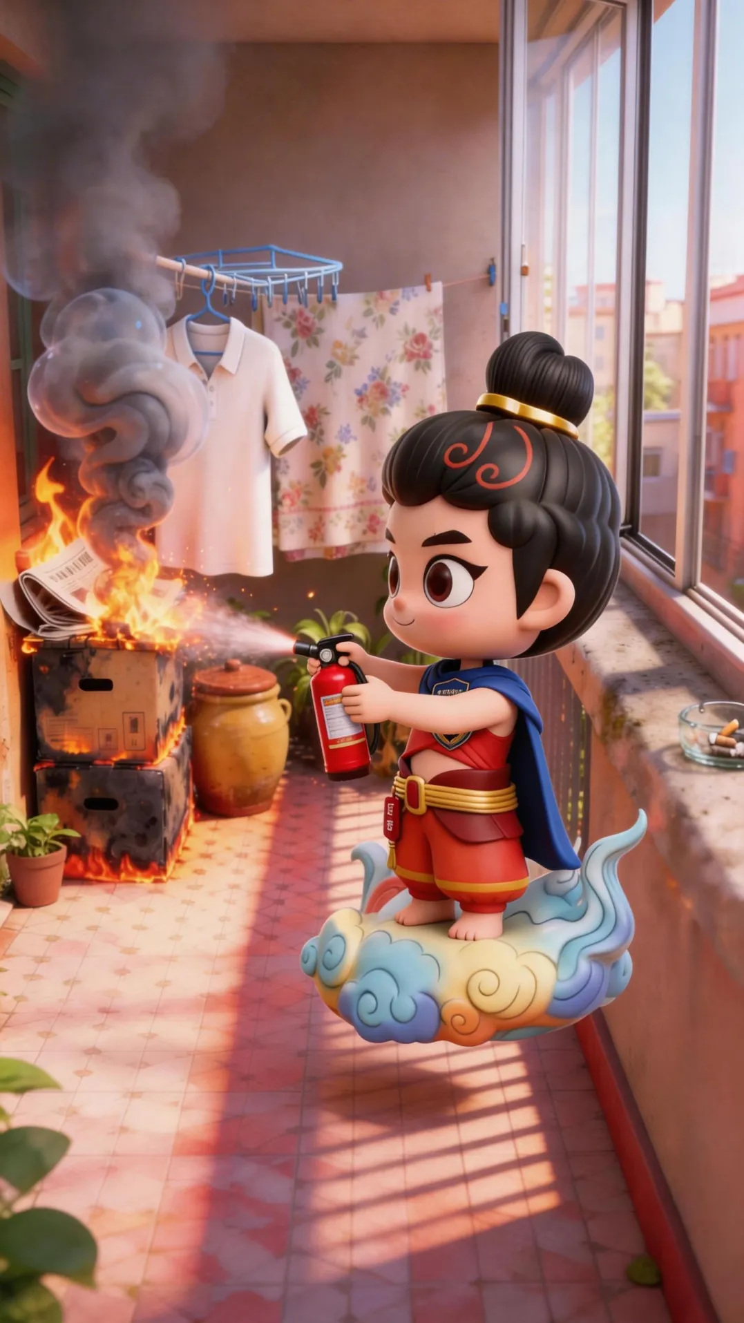 陇司煊冲上阳台,灭火器对准纸箱喷射。火苗被扑灭,纸箱烧了大半。赵爷爷和李奶奶目瞪口呆……