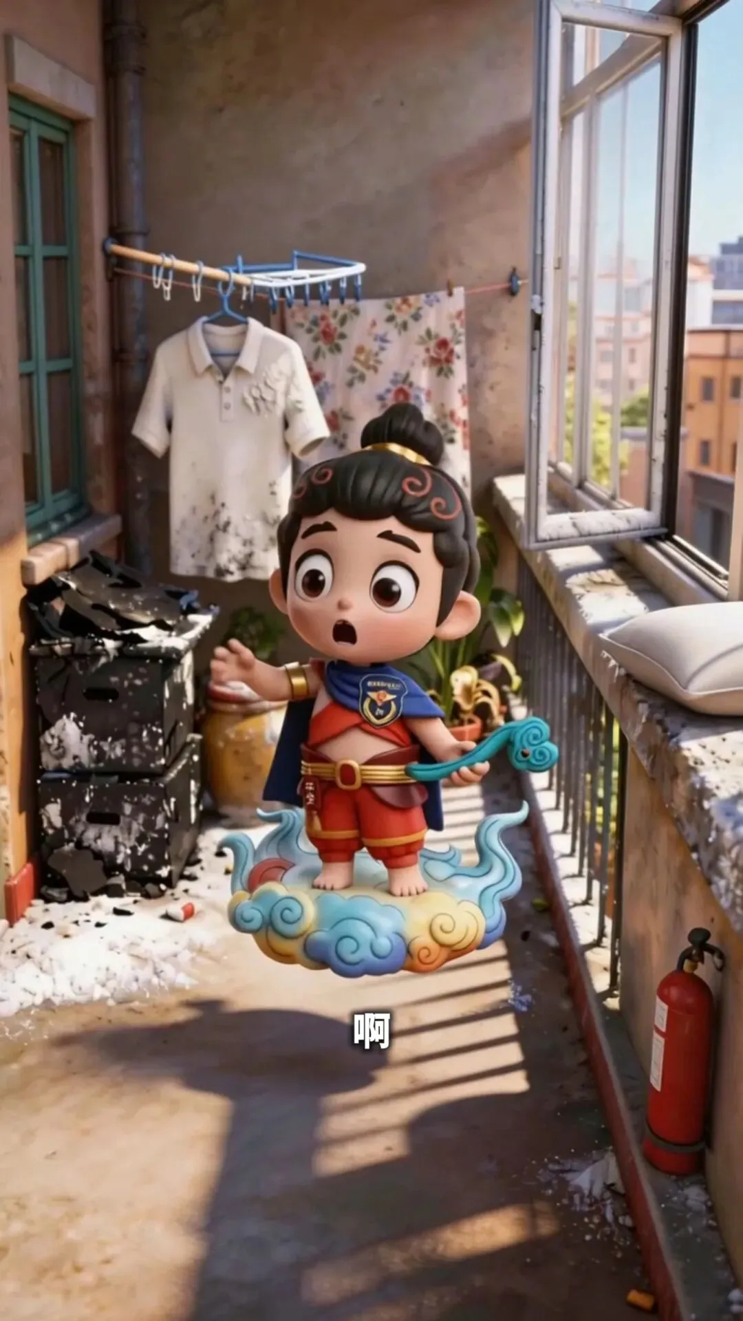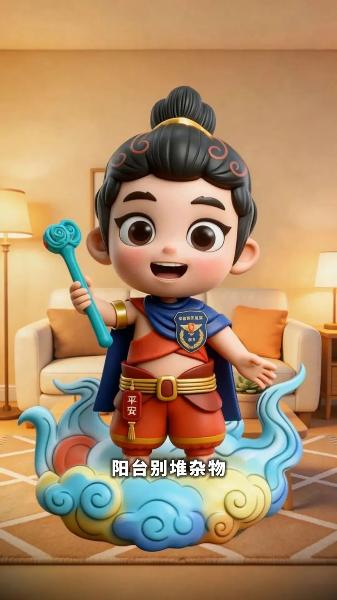 “春季防火记心上——阳台别堆杂物,烟头一定掐灭。还有啊——吵架别扔东西!”