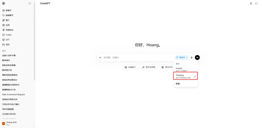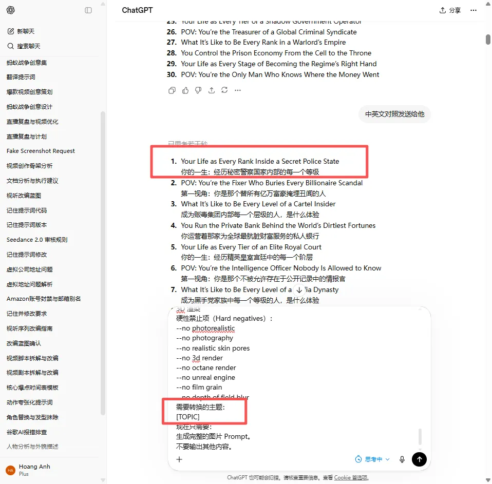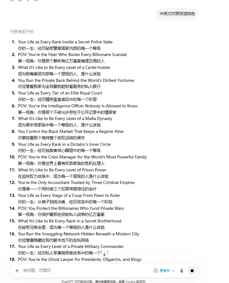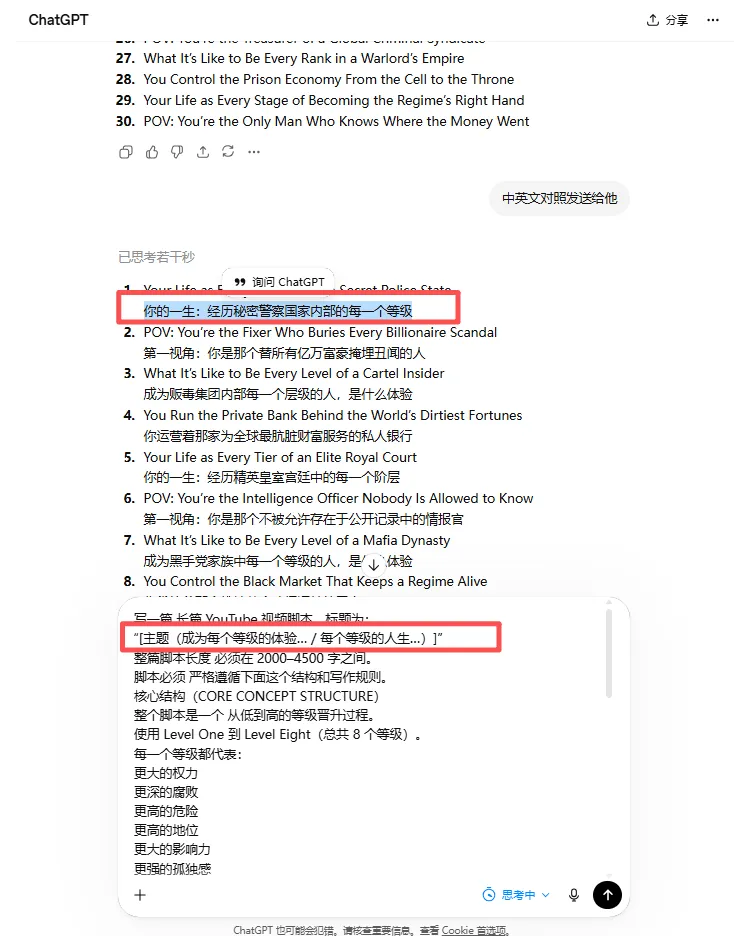 我们复制第一套提示词,用来生成视频选题。打开 ChatGPT 后,记得一定要把模式切换为Thinking 思考模式,再粘贴提示词发送。如果生成的内容是英文,你可以直接让 AI 按照中英文对照格式重新输出,方便你理解和修改。